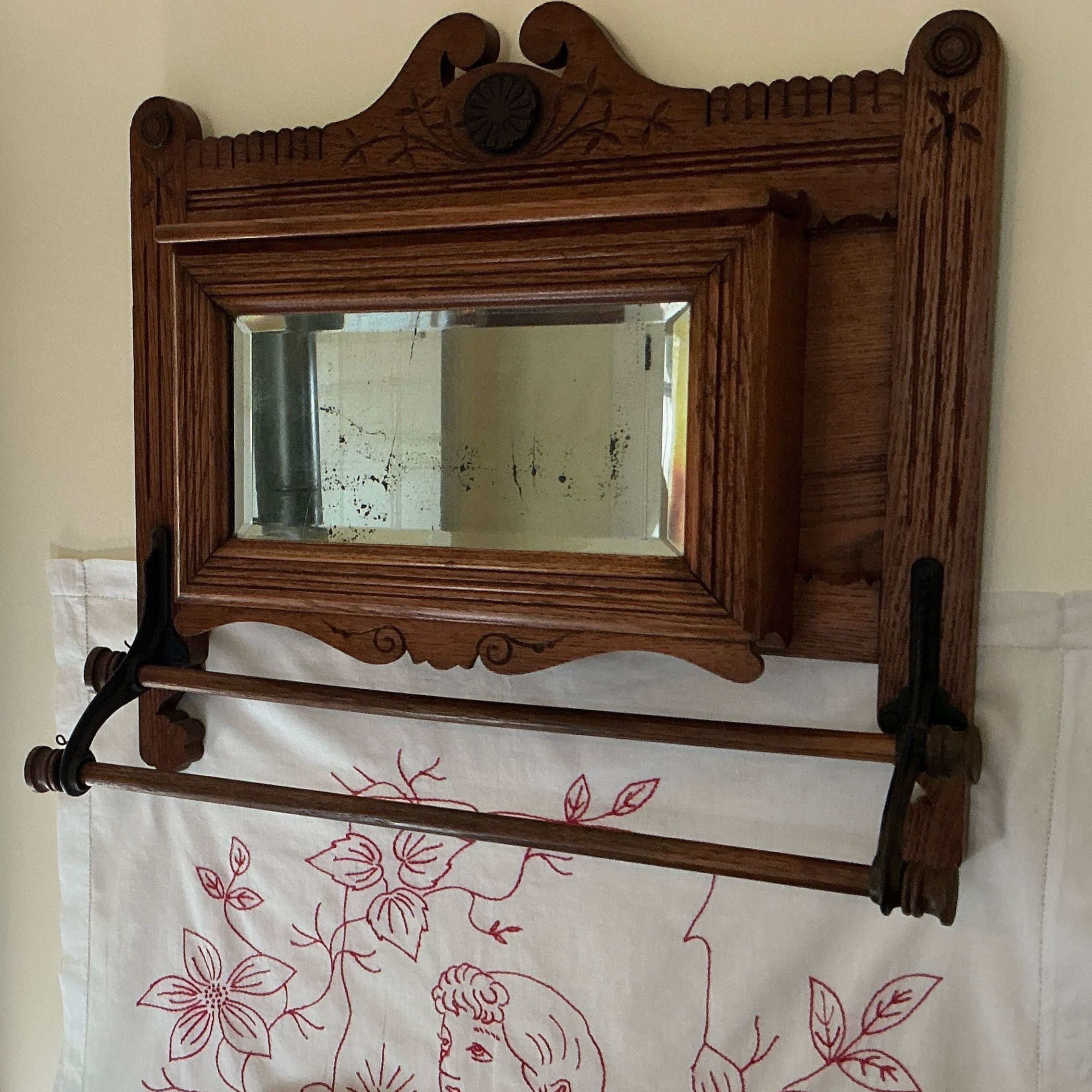 Wooden towel rack. Incised design with medallion in darker wood above & incising below and where metal brackets hold two wooden bars. Lidded & hinged top for storage compartment behind the beveled mirror.Context