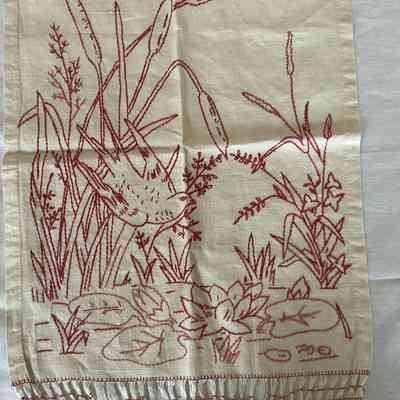 Huck Hand Towel with crocheted edges and red designs