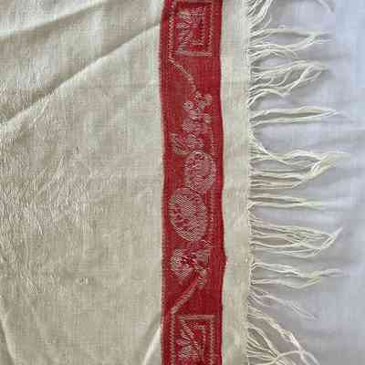 Towel with red and white woven design and fringe on both ends