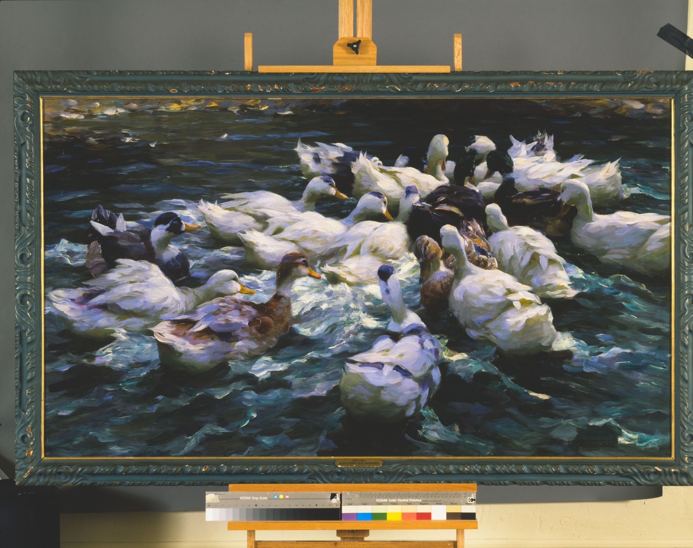 Painting of a group of feeding ducks by Alexander KoesterCataloged By