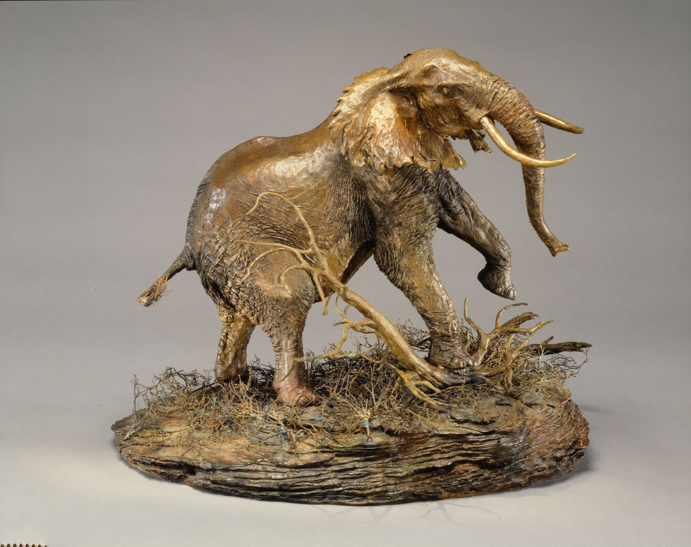 Bronze Sculpture of an elephant trampling some brush by Paul OestreicherCataloged By