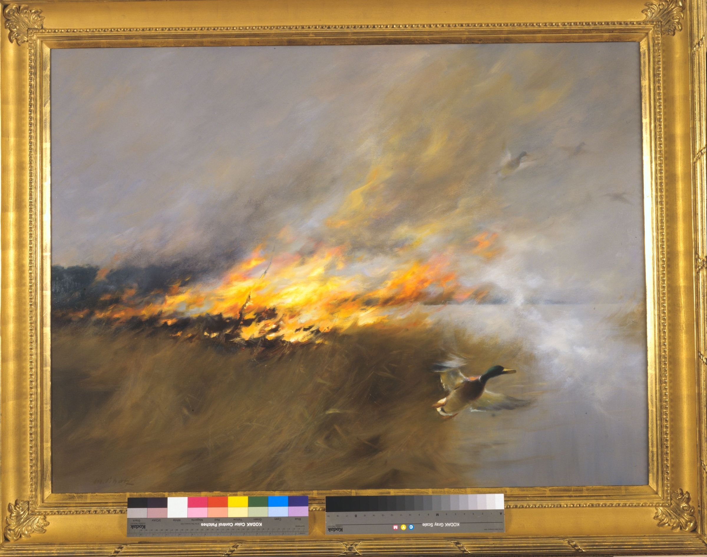 Painting of Mallards fleeing a fire in a swampy territory by Manfred SchatzCataloged By