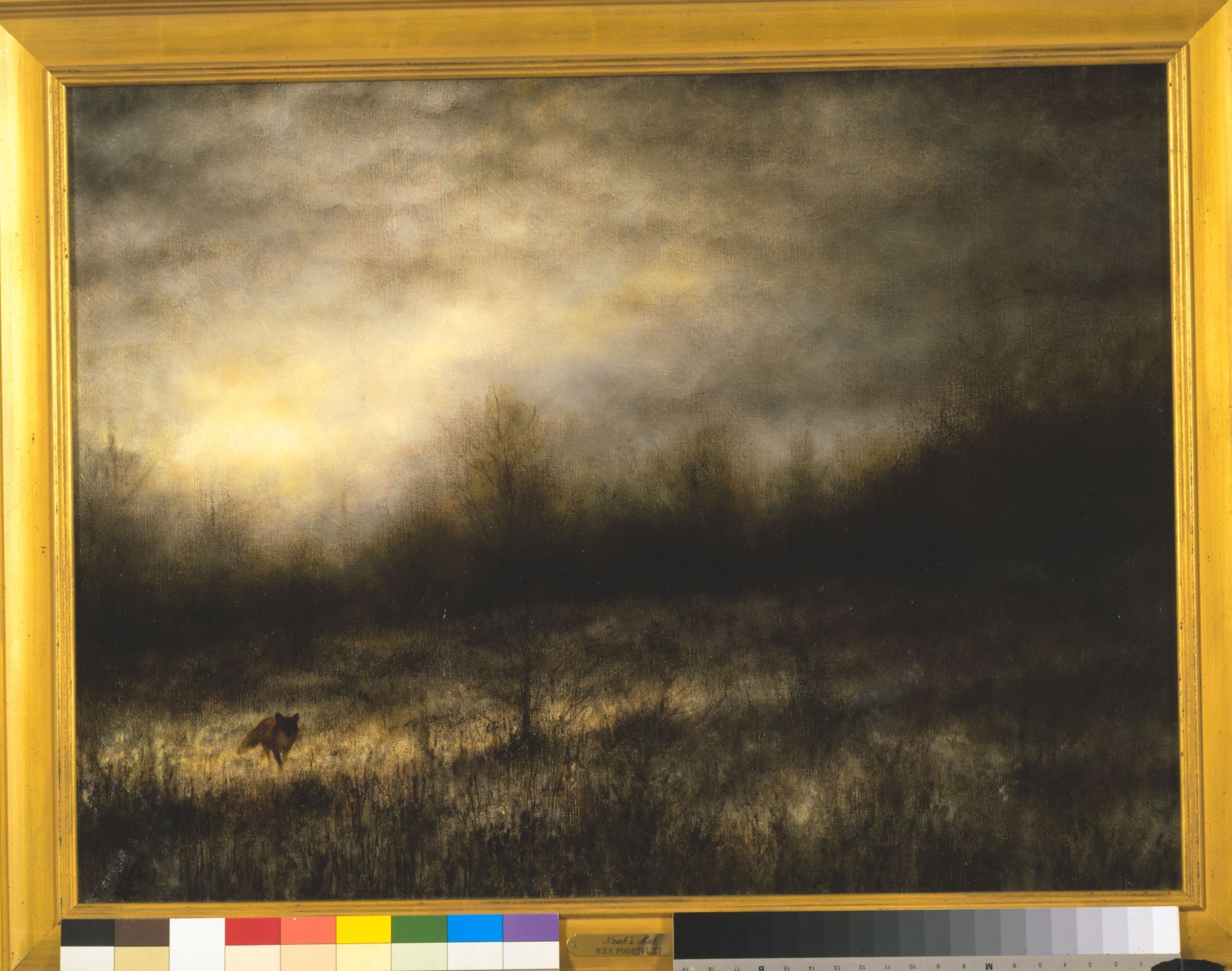 Oil on paper of a fox traversing a wooded landscape by Rien PoortvlietCataloged By