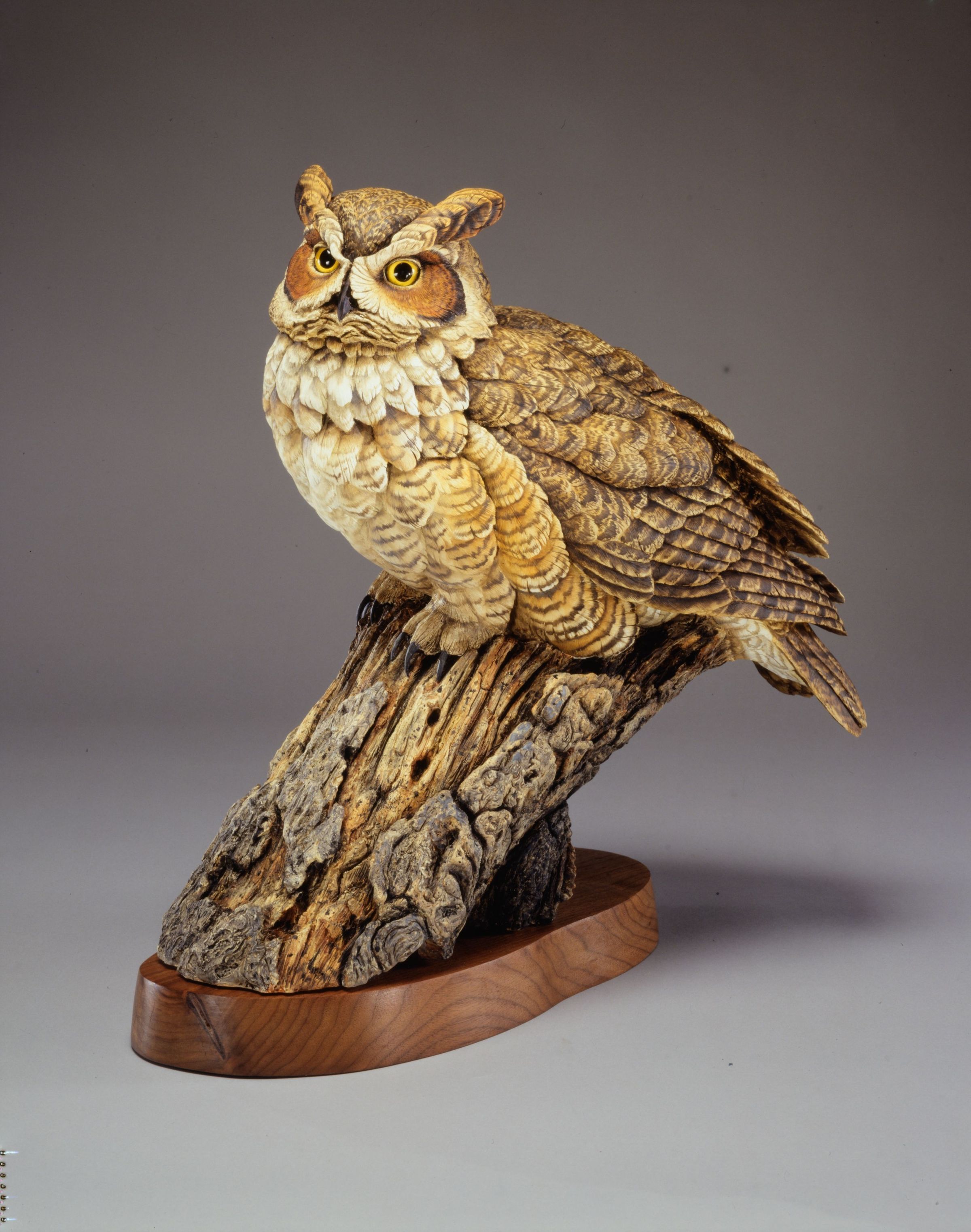 Sculpture of a Great Horned Owl by Paul Brunelle, sculpted in Fired Clay and painted in oilsCataloged By