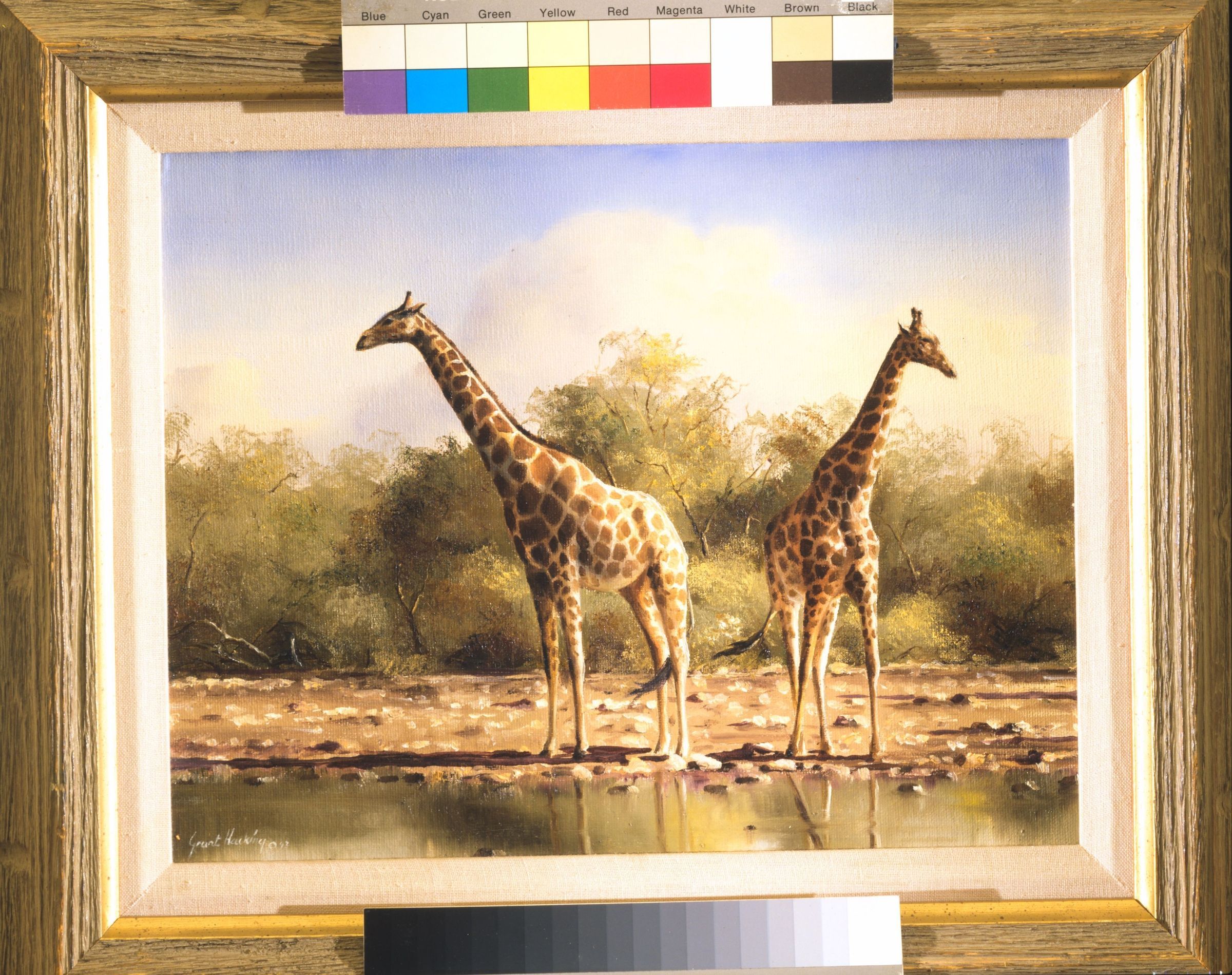 Painting of two giraffes by a body of water, by Grant HackingCataloged By