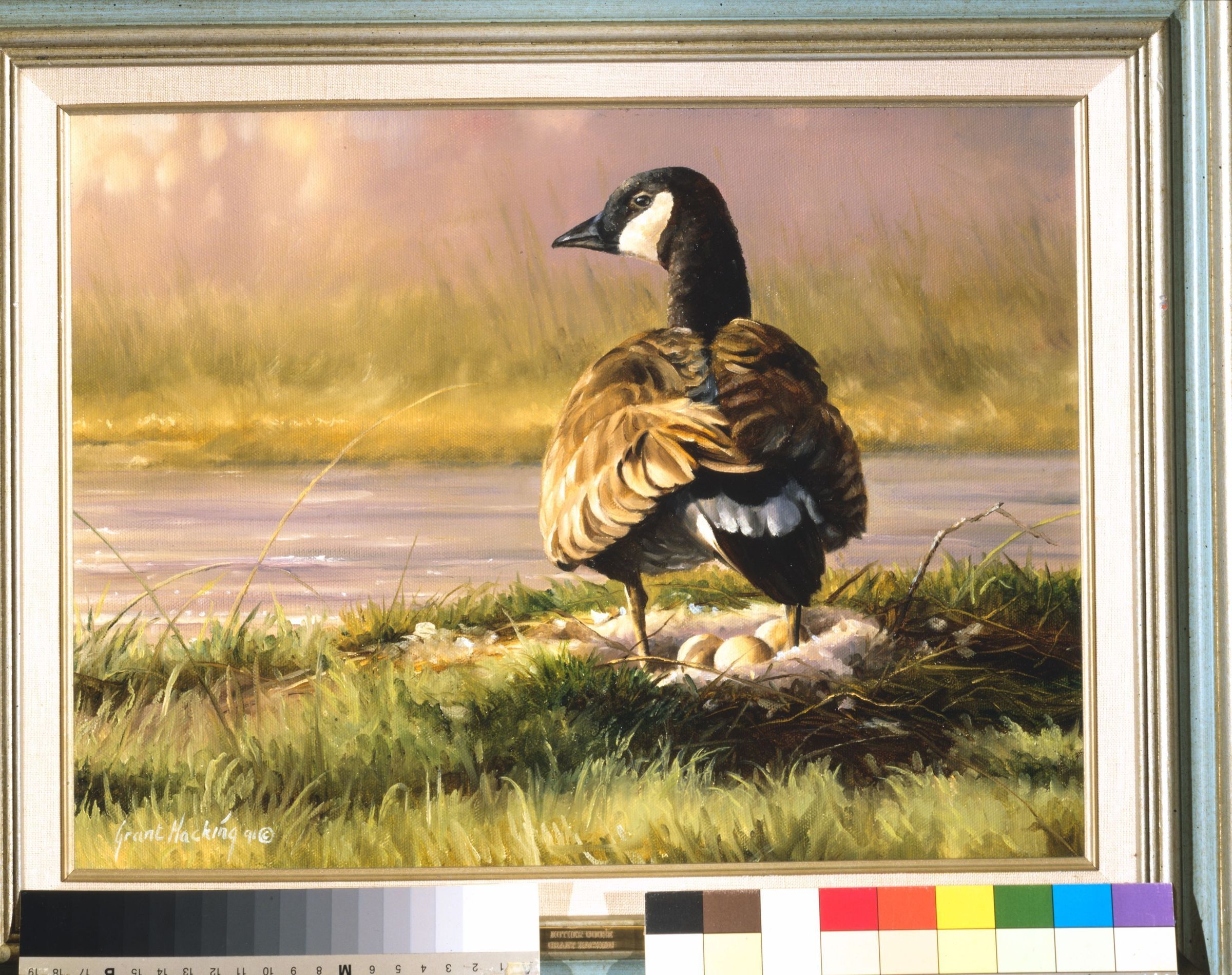 Painting of a black goose brooding over a clutch of eggs by Grant HackingCataloged By