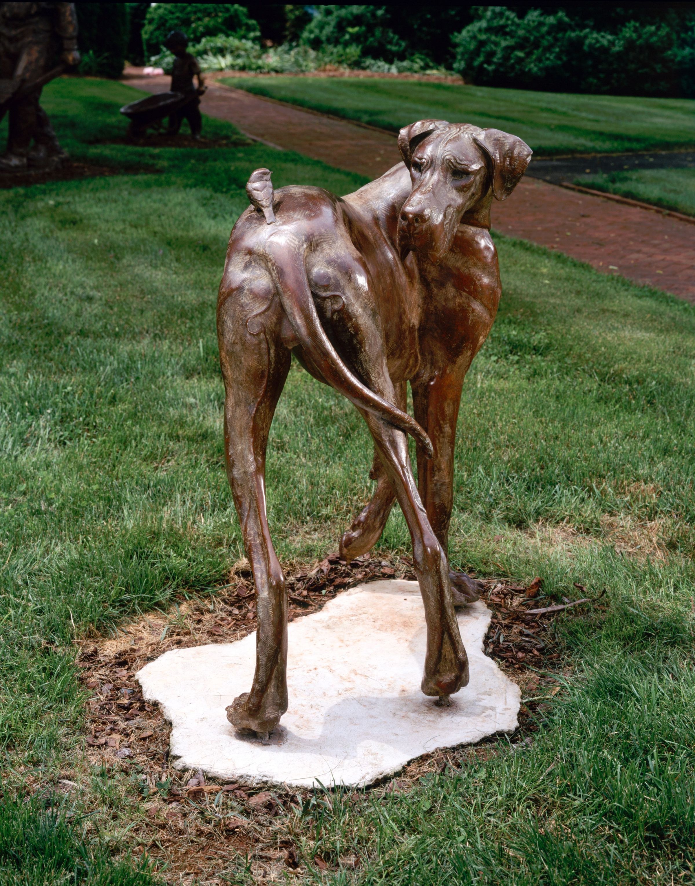 Bronze sculpture of a Great Dane looking at a Chickadee bird alighted on its back by Louise PetersonCataloged By