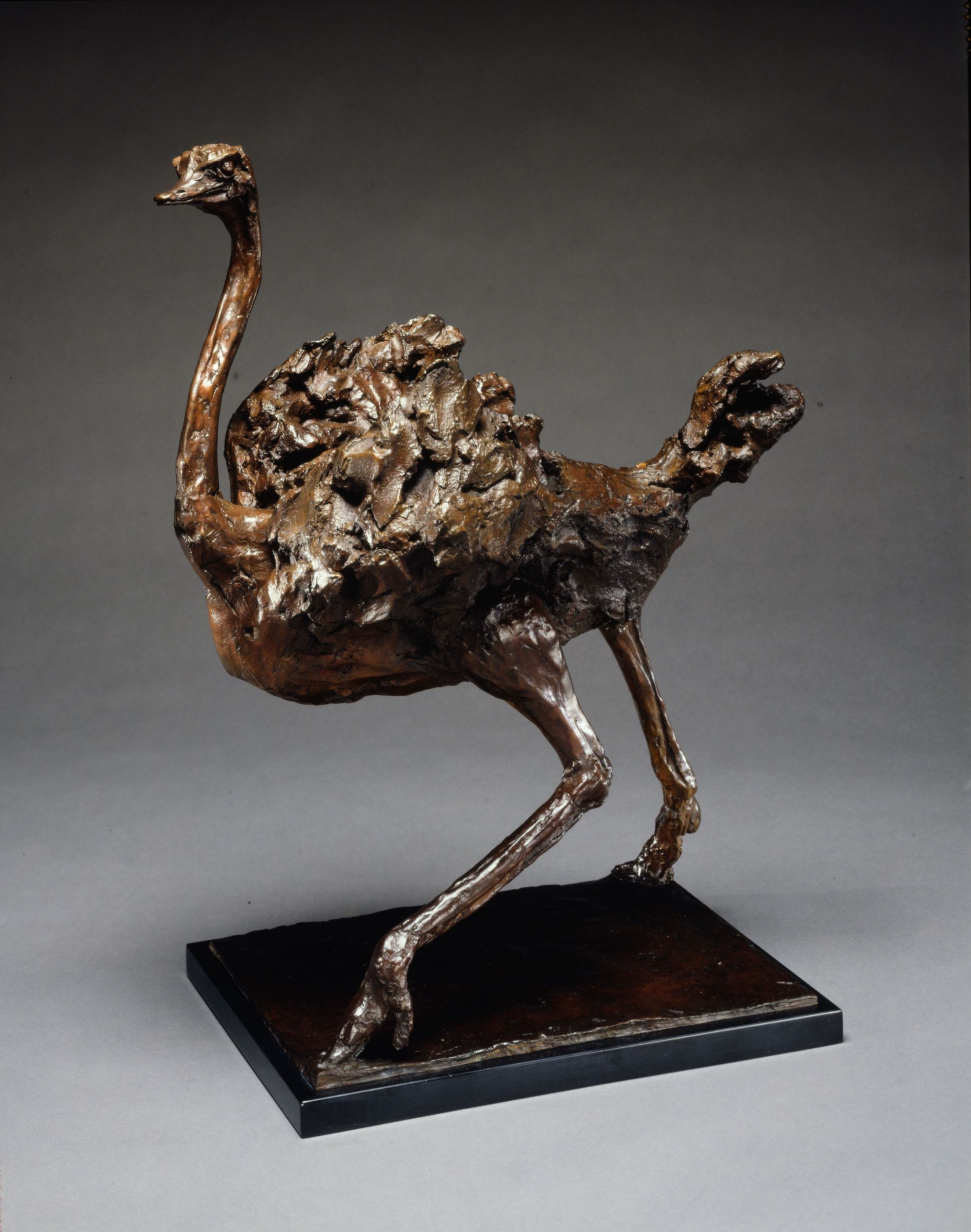 Bronze sculpture of an ostrich with one leg extended forward, by Mark CorethCataloged By