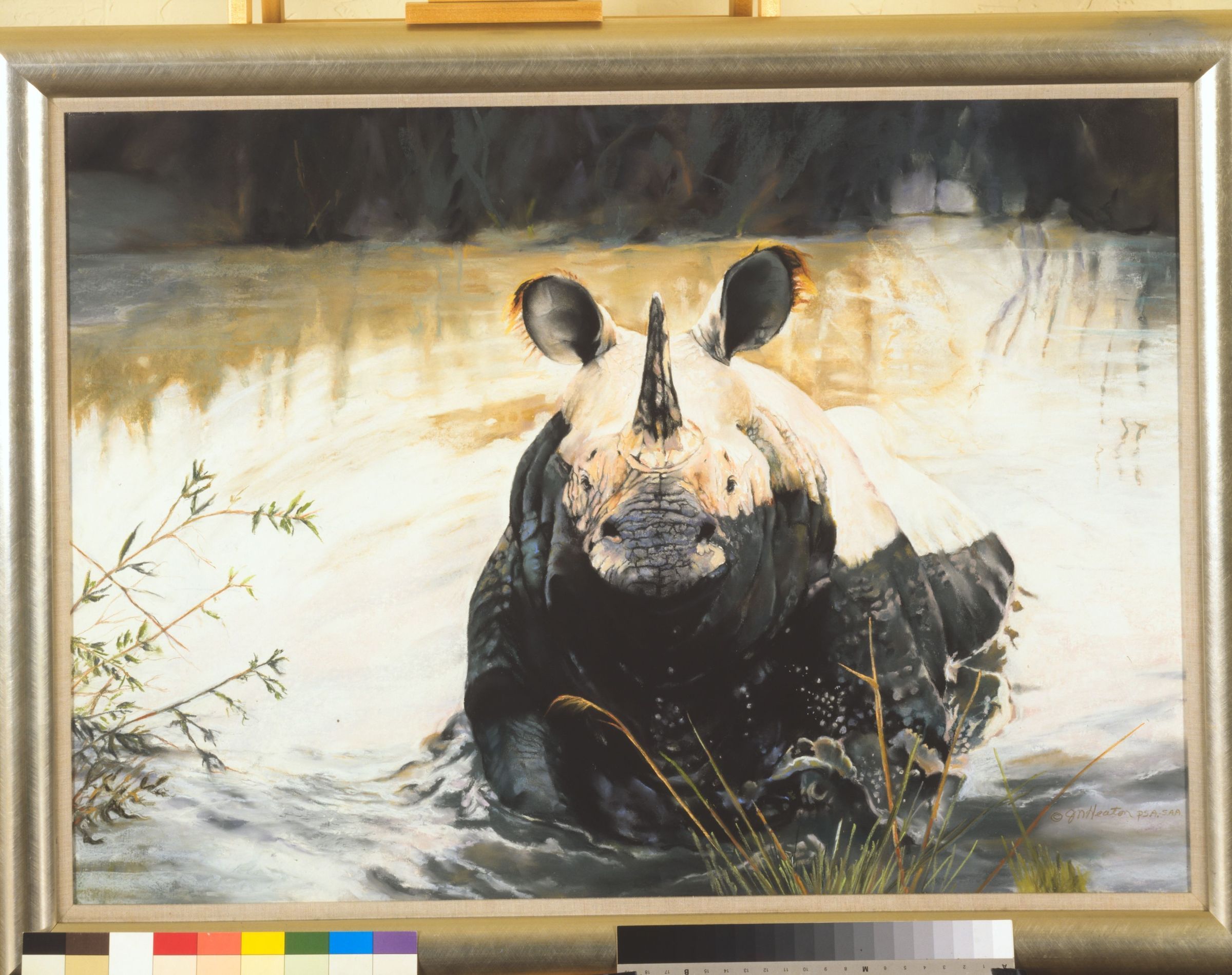 Pastel drawing of a rhino emerging from the water, by Janet HeatonCataloged By