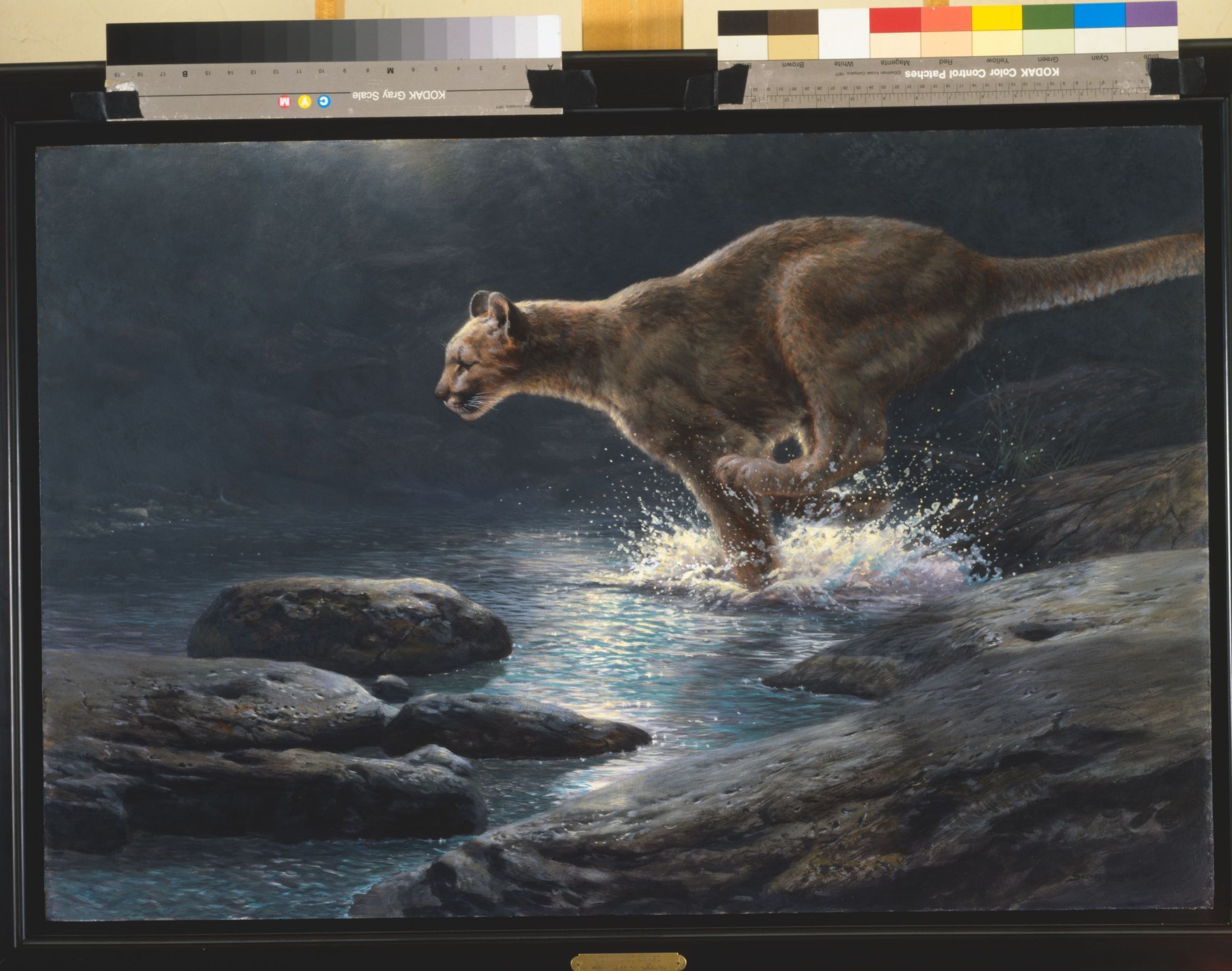 Painting of a cougar sprinting over a stream by moonlight by John Seerey-LesterCataloged By
