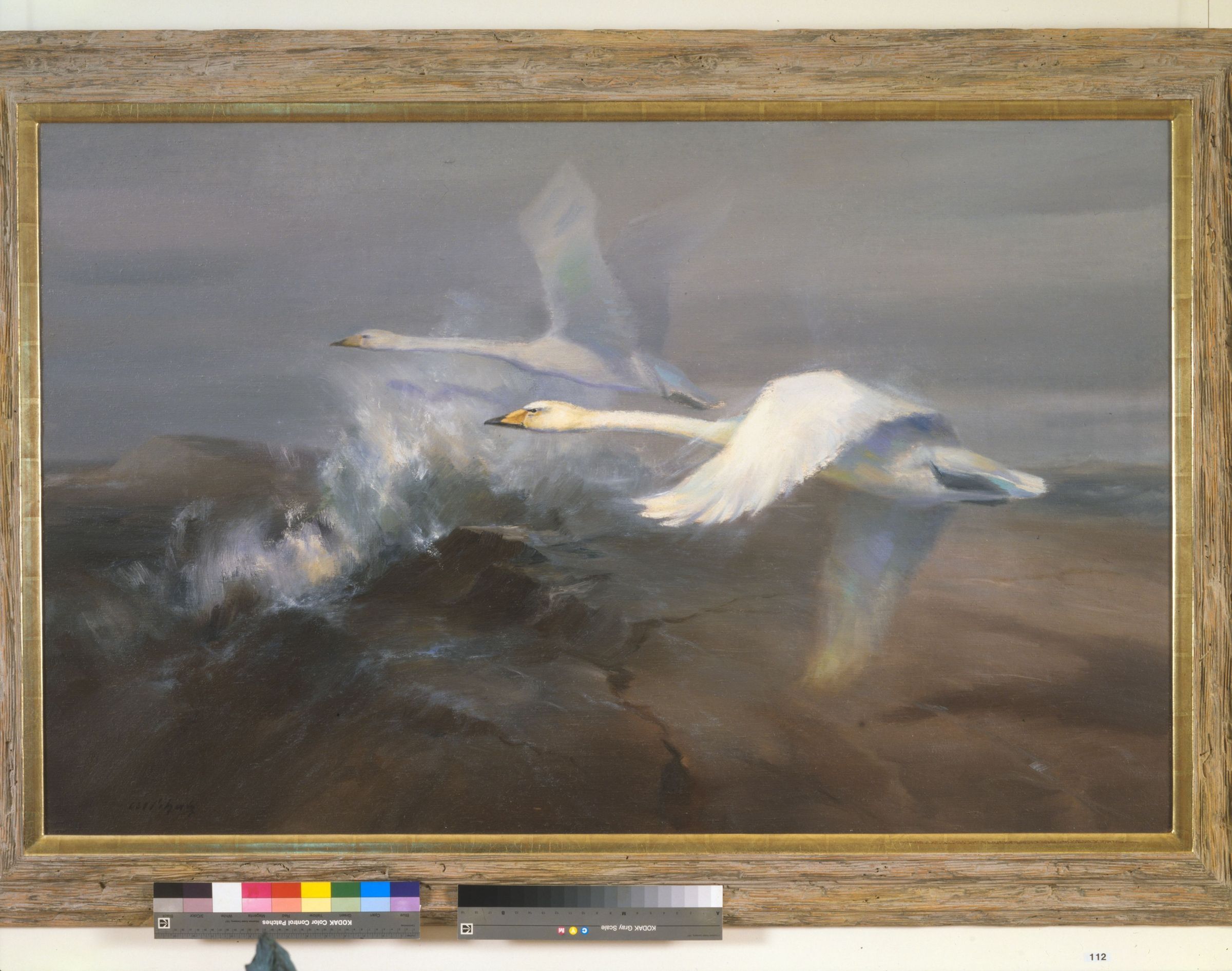 Painting of two geese flying over rocks, waves breaking, by Manfred SchatzCataloged By
