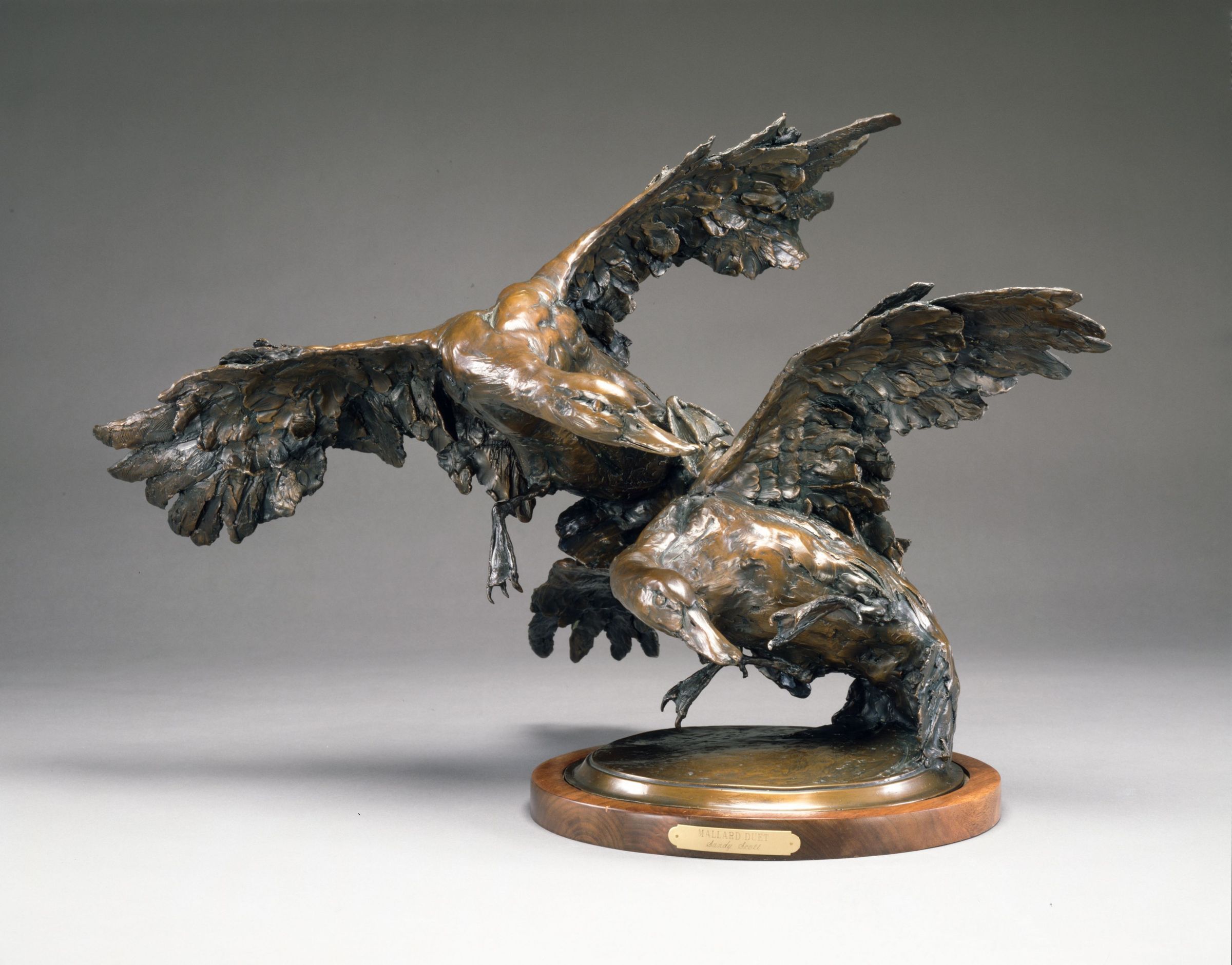 Bronze Sculpture of two mallards on the wing by artist Sandy ScottCataloged By