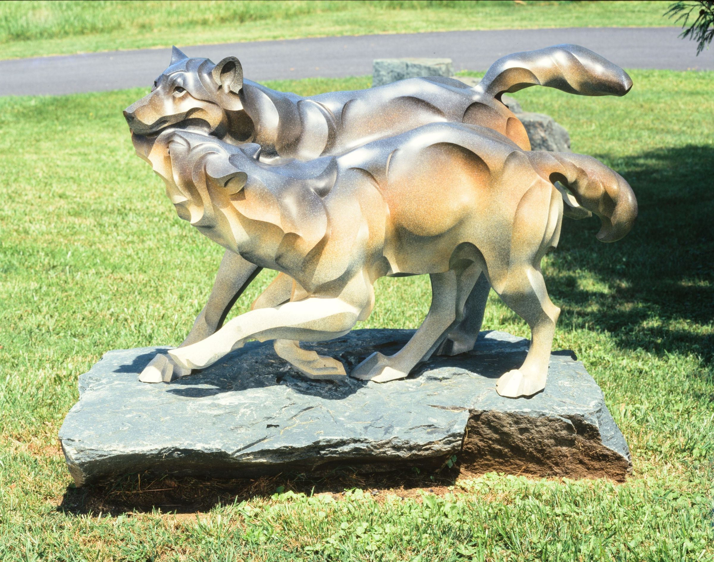 Sculpture of two wolves in stride by Jan RosettaCataloged By
