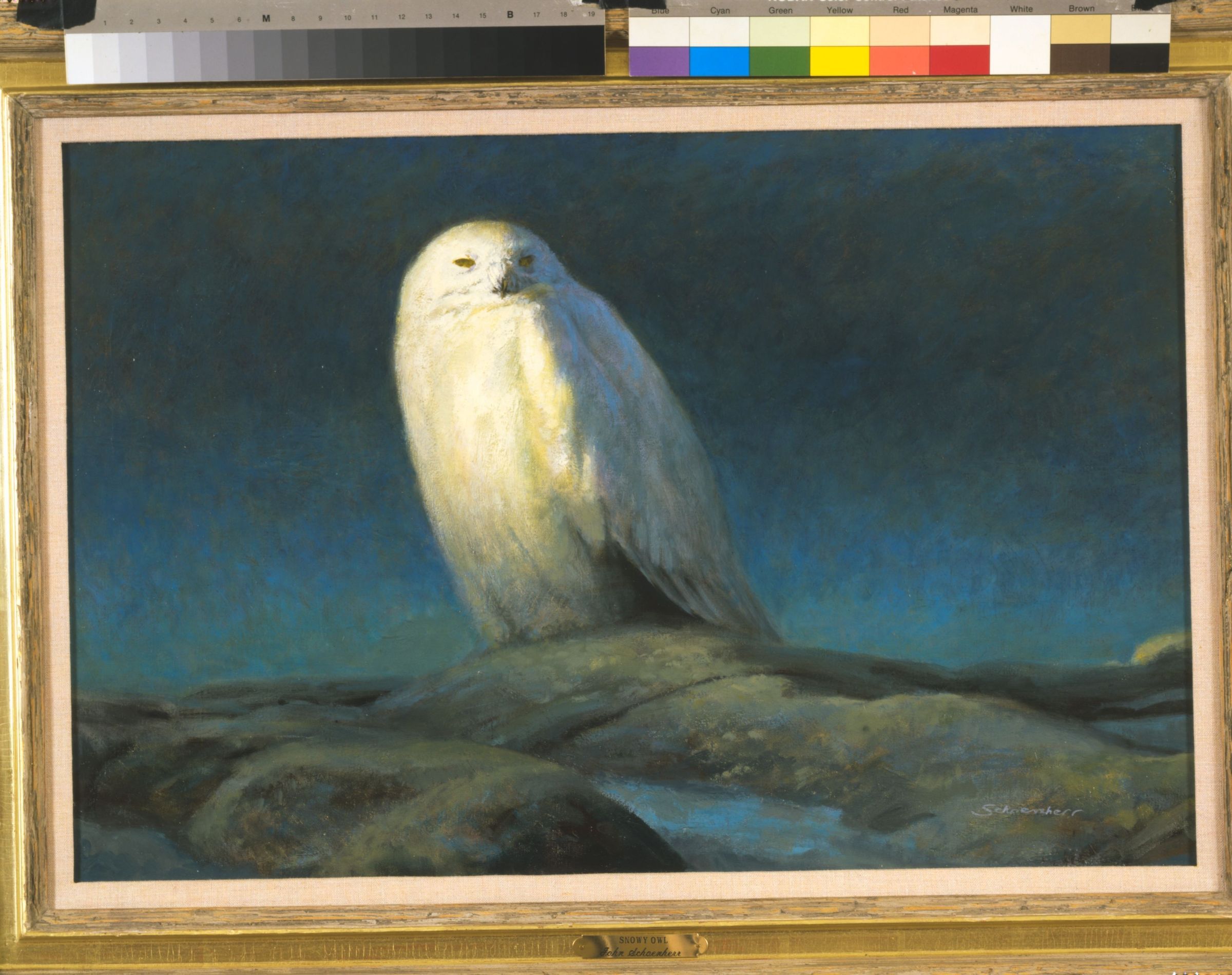 Painting of a Snowy owl perched on a rock by John SchoenherrCataloged By