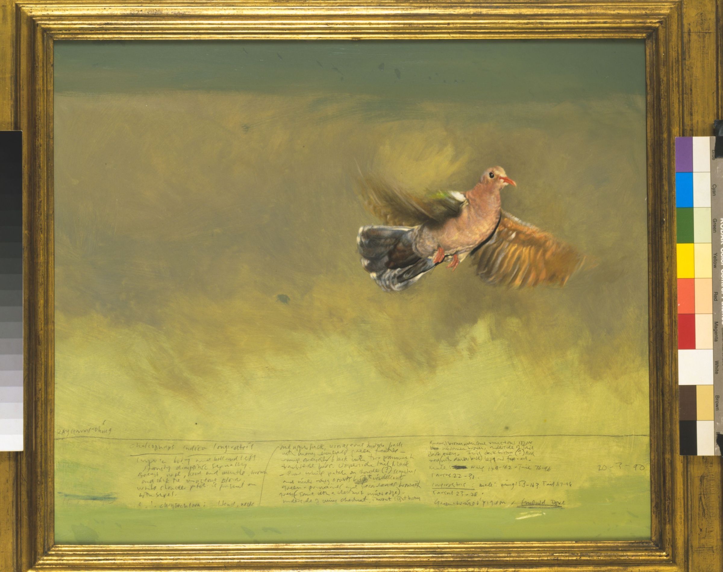 Painting of an Emerald Dove in Flight against a green background by Raymond Harris-ChingCataloged By