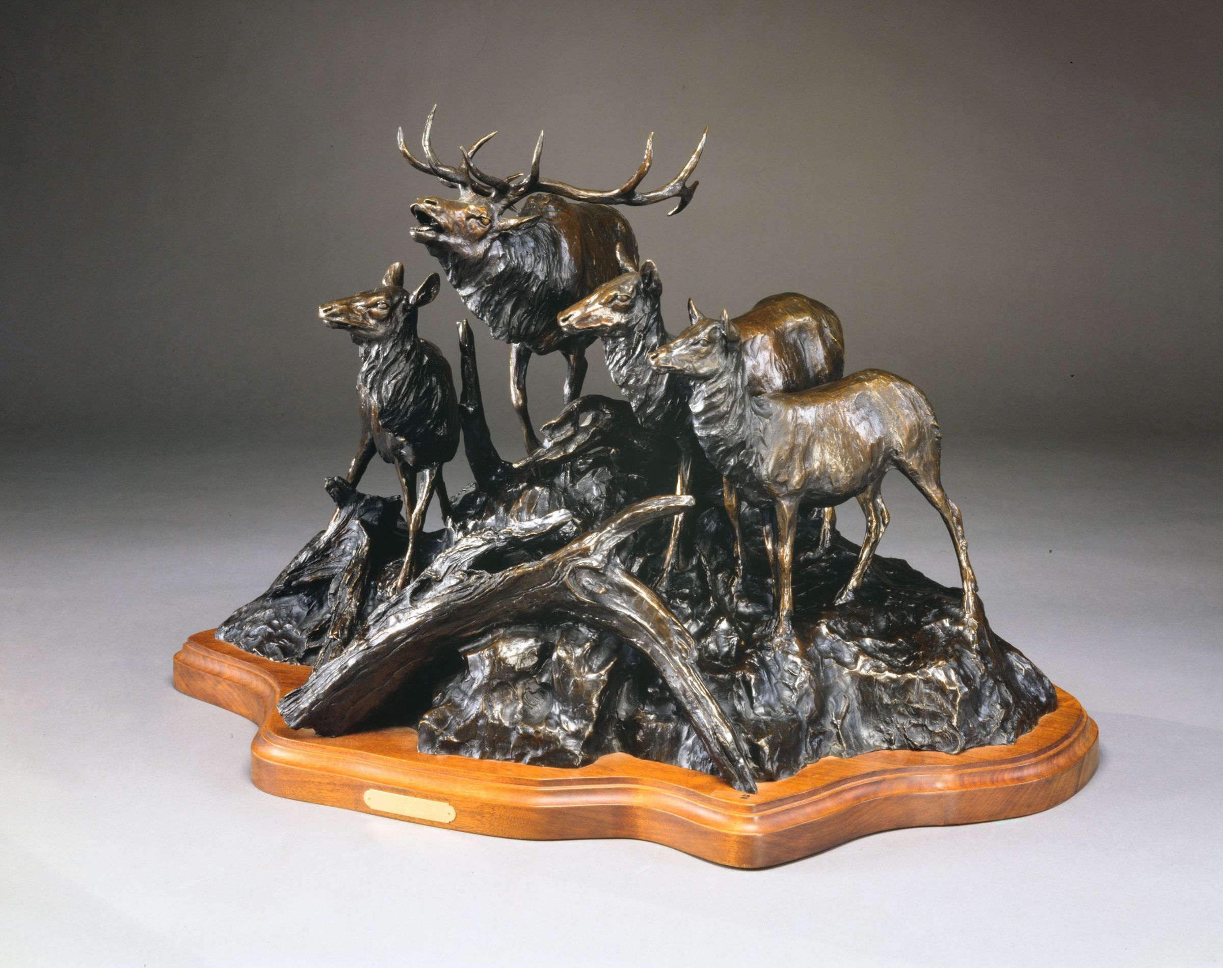 Bronze Sculpture of a male elk at bay with three females by Veryl GoodnightCataloged By