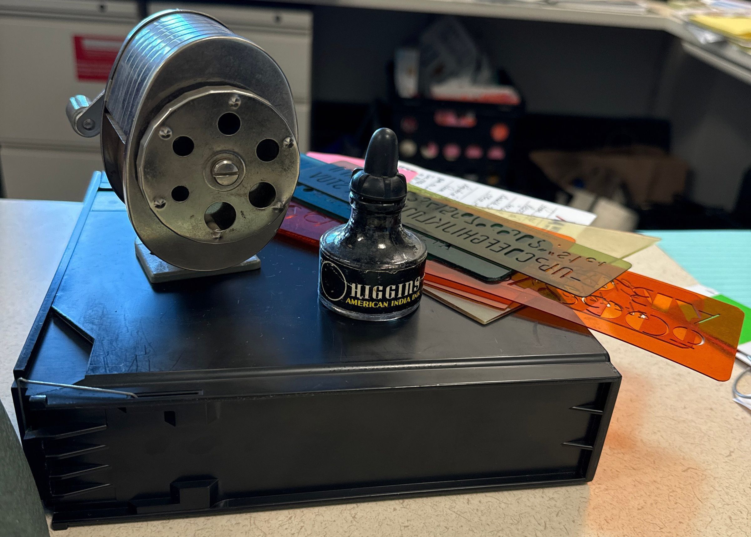 Old Pencil Sharpener, Stencils, Floppy Disk, and Pen Ink