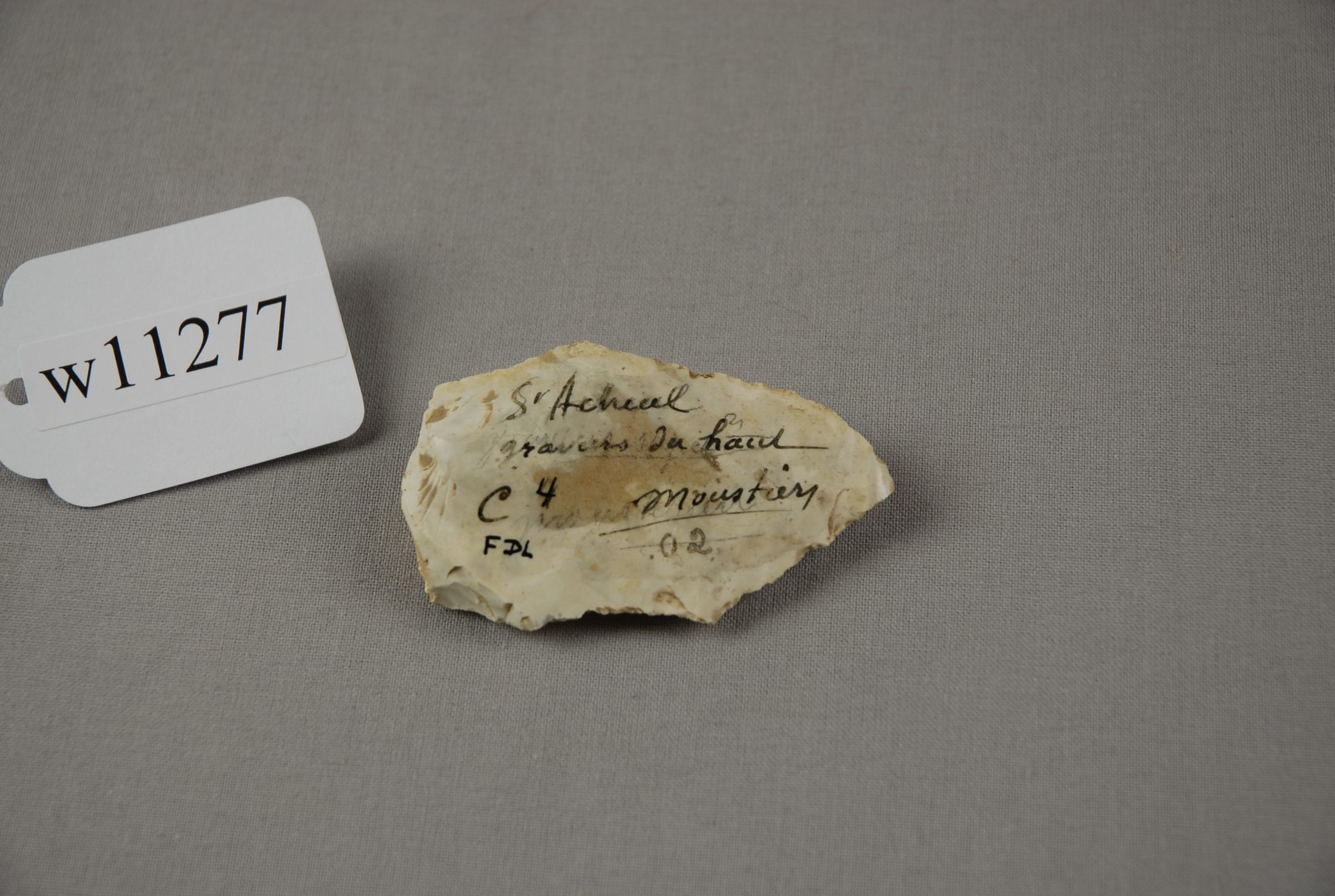 Mousterian point - white patina. Surroundings being a fine bed of sand and gravel of white flakes.