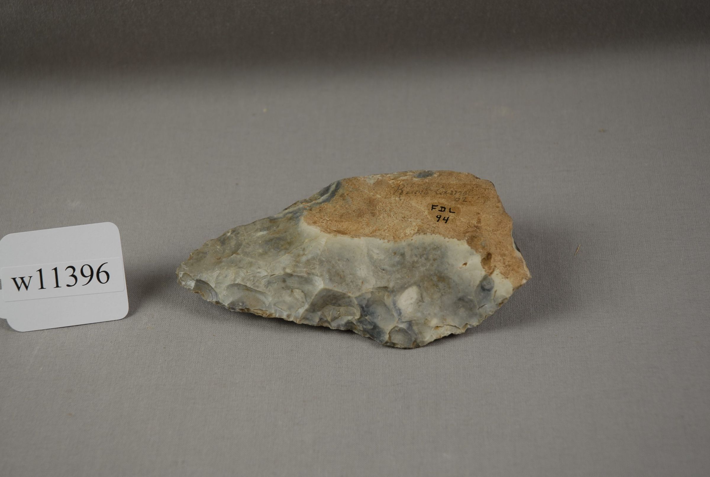 F DL(x) / w11396 Hand axe? Lower Paleolithic - Chellean [Acheulean] Period [? ?] 02 / Near Amiens, France 94 L. Delambre, Purchased 1903 - J.H.W.