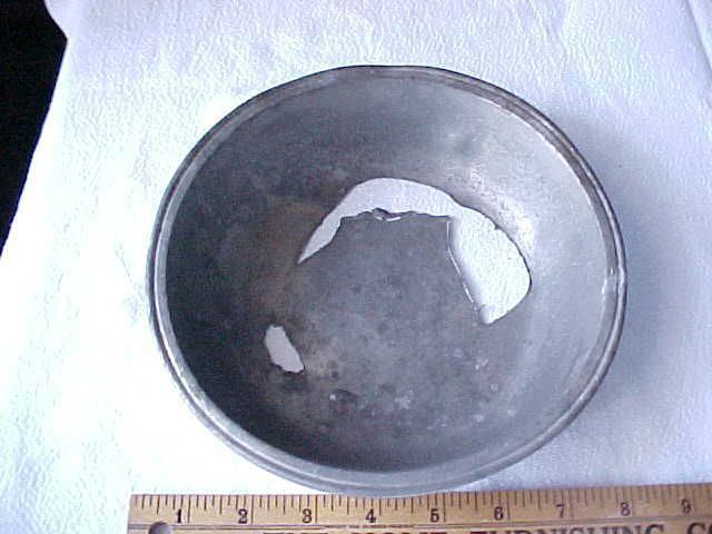 Pewter basin from Perkins House, 7 3/4", eagle & stars touchmark, damaged (partially melted?)