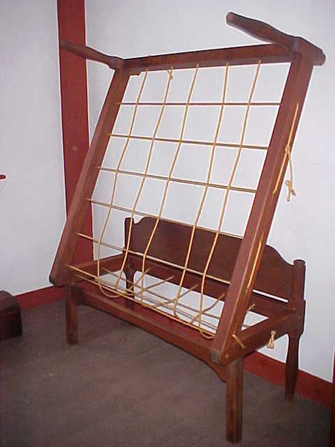 HFA / w04276 Bed - folding rope bed. Red stain, from house near Castine. Gift of Charlotte Rodman. American folding trundle bed in old red paint. Maple c. 1820-25, 53 1/2" wide