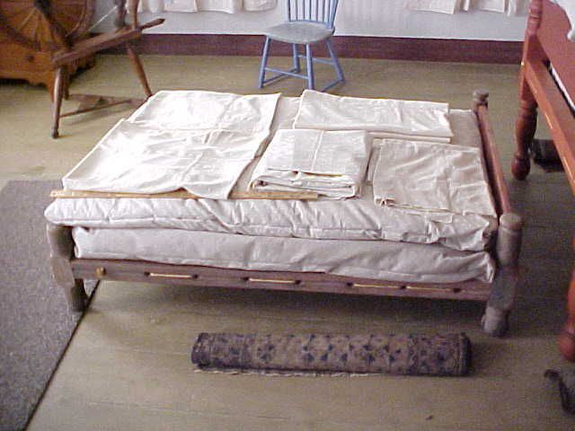 American trundle bed in old red paint, maple and pine. c. 1825. Original finish [except for headboard?], 44" x 60"