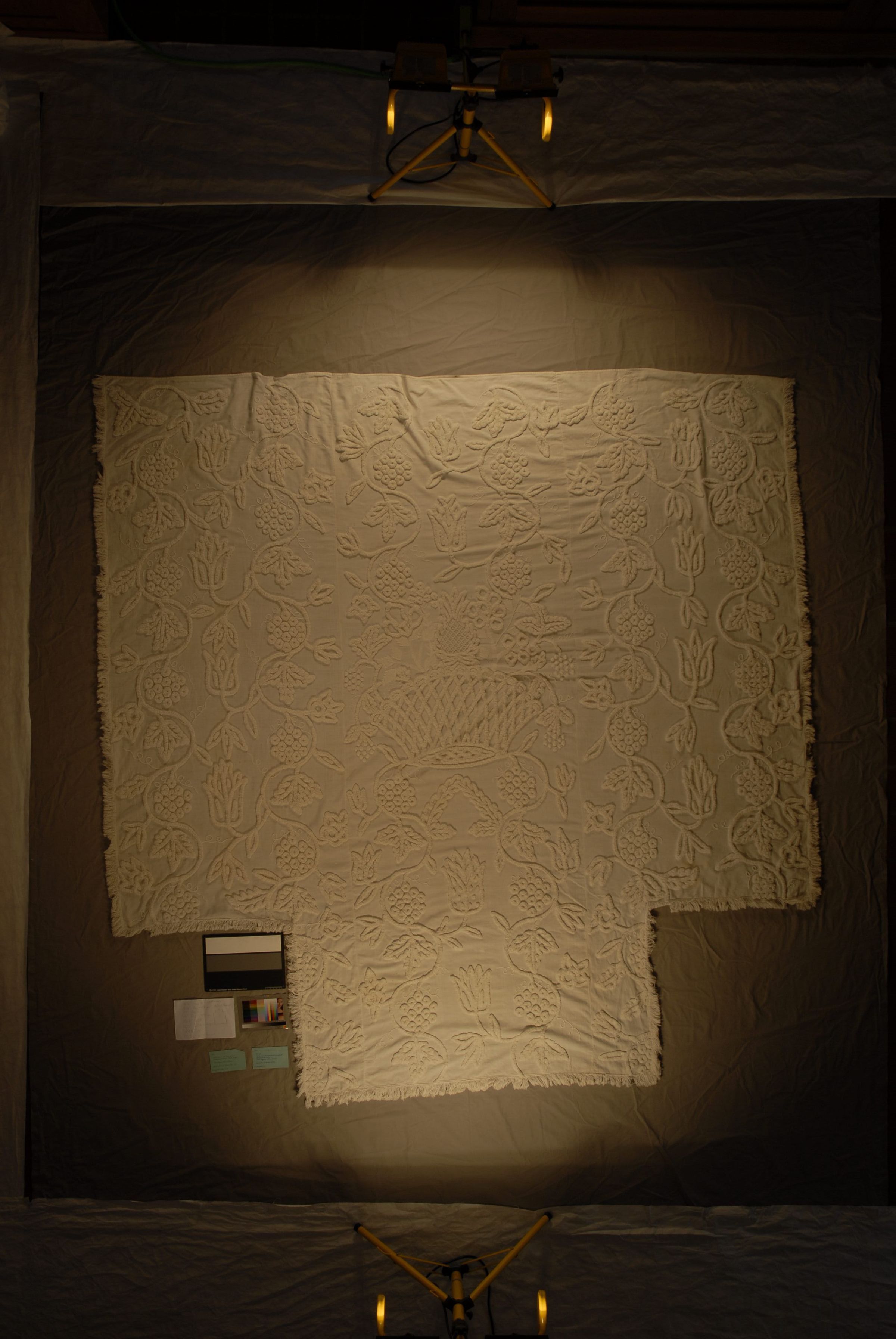T-shaped whitework embroidered bed cover, worked with white cotton yarns on a white cotton background with a tufted stitch, creating a highly textured textile. (Commonly called "candlewicking" today.) The embroidery pattern features a central basket design with a pineapple, surrounded by vines with grapes and tulip-like flowers. The bed cover is edged on three sides (all except top) with plain white cotton fringe. The backing fabric is plain white cotton, pieced of three lengths (thus two seams); the width of the fabric is 32/4 inches. One area in the vicinity of a cut-out is also pieced. The cut-outs measure 24: L x 2t6" W. lzb, 10/24/07