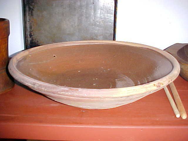 HUF / w04421 / PH Pottery Bowl. Red ware - glazed on inside. Base is 9 1/2" diameter, top rim is 17 1/2" diameter. Shallow - only 4" high. Roland Howard estate Aug. 1988 American stoneware bread bowl.
