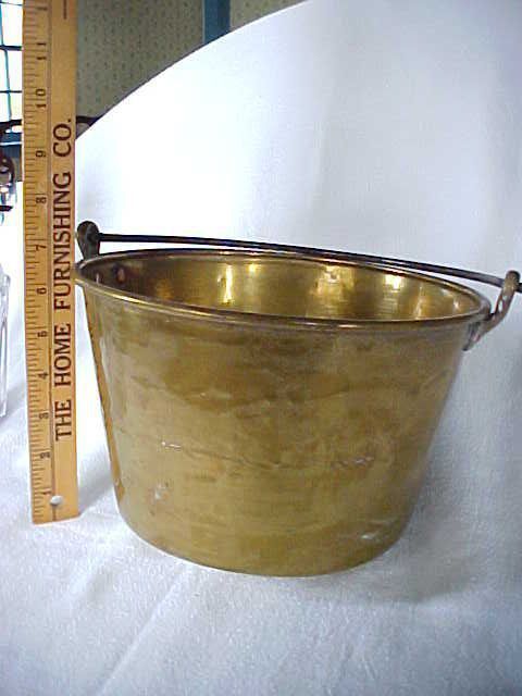 HK / w04435 / PH Brass pail. 8 3/4" diameter at top, 6" high, bottom rounded. Mr. & Mrs. Sherman Schumacher 1969. American spun brass kettle with iron bail handle, 9 1/2"