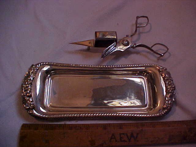 English silverplate candlesnuffers and tray. c. 1830-50.Tray: 10" l Snuffers: 7" l.