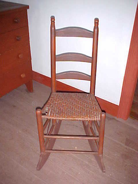 HFC3 / w08819 / PH Ladder back rocker - repaired. Gift of Mrs. Percy Sargent. American ladderback rocker with ash splint seat, old red paint. c. 1800, [erroneously noted "style": ladderback]