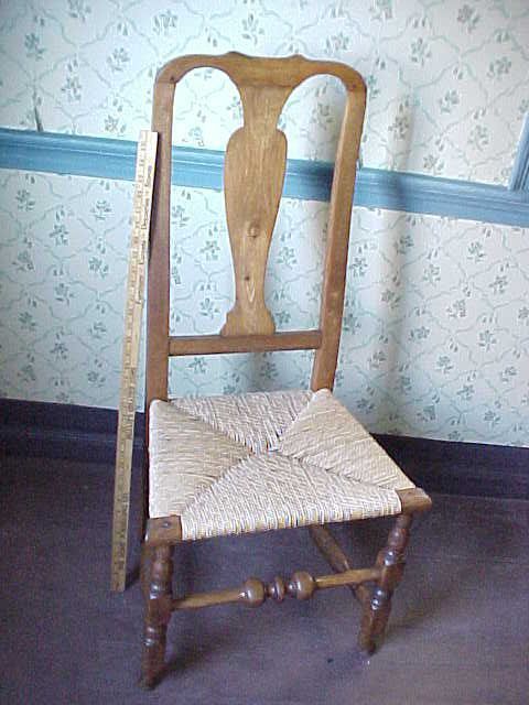 American country Queen Anne side chair with rush seat (replaced), urn form splat, yoke form crest rail, turned legs and stretcher, hoof feet. 40" h at back. c. 1750-60. Stripped and refinished