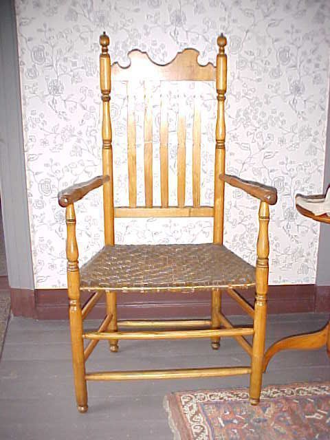 American banister back armchair with turned uprights, finials, arms and legs. Ash splint seat, crown form crest. 48"h at back, 24 1/2"w at arms. Original paint removed. c. 1740-60.