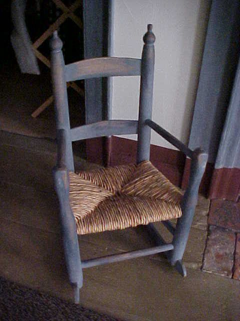 American child's ladderback rocker with rush seat. Blue paint. 24" h., c. 1820.