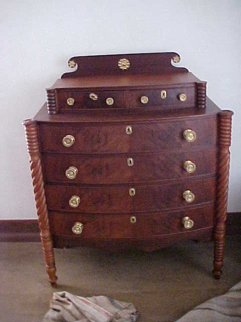 American Sheraton mahogany bow front chest of four drawers with two narrow setback drawers on top. Spiral turned legs, cookie cutter corners, scrolled backsplash. Brass rosette pulls. Scroll cut apron. 39 1/2" wide x 48" high, c. 1820-25.