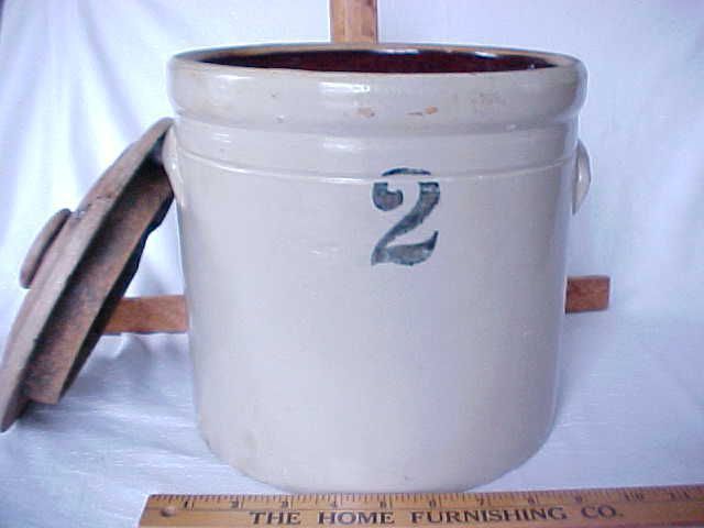 HUW1 / w04456 Crock Large - white. Chipped lid. "2" on front 9 3/4" top diameter, 9 1/4" tall. Donor Forrest Myers. '77'. Two gallon American stoneware crock with handles, 9" crock, handled