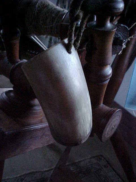 Hsp / w04270 Small cup Bone with wood bottom used to hold water for flax spinner's fingers. Came with the blacksmith tools from Sewall Ginn. 1968. Horn, not bone Cup, flax spinner's