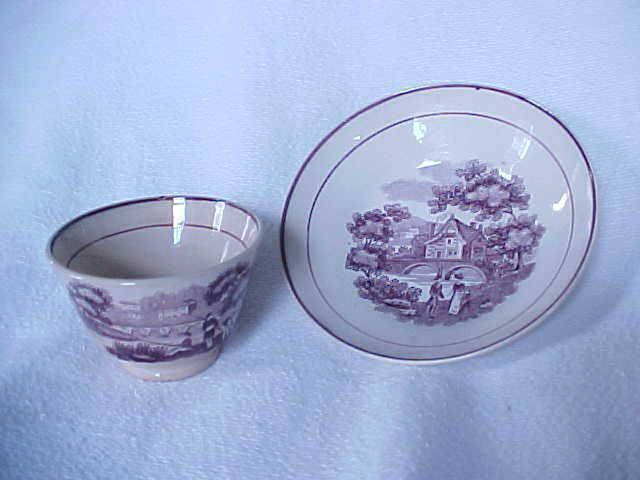 English mulberry transfer handleless cup and saucer, child's size. c. 1825-30, [erroneously noted "style": Mulberry transfer]