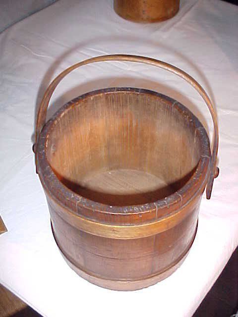 HUSF / w04317 / PH Firkin 9 1/2" tall, 9" diameter at top. Wooden handle, wooden straps. Gift of Sherman Scumacher 1969 Firkin (pail)