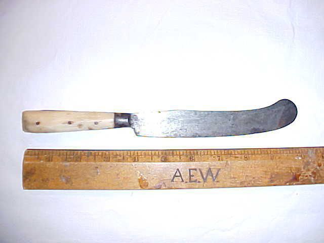 w08828 20" knife with ivory handle. 3 metal fasteners in handle. Curved blade. PARKER[?]V[?]