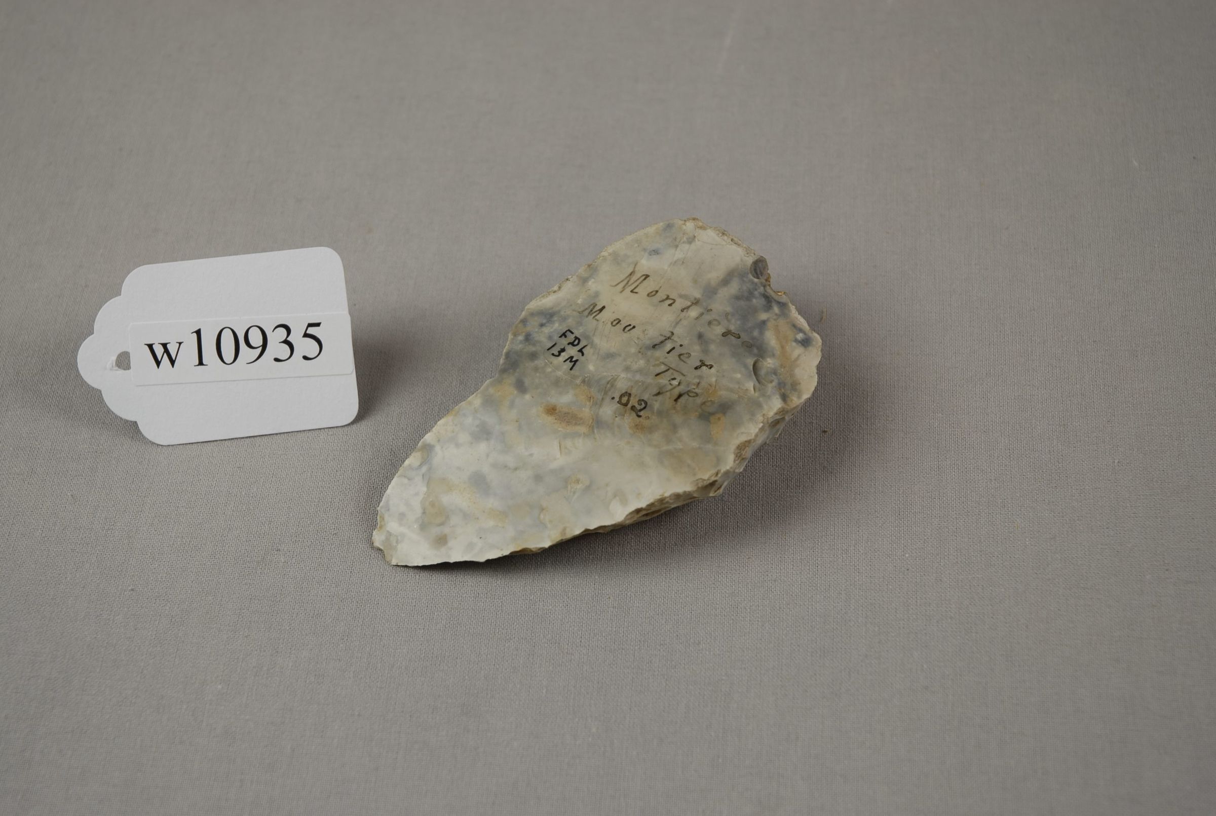 F DL / w10935 Knife Mousterian type Montiers, Near Amiens, France 13M L. Delambre, Purchased 1903 - '06 - J.H.W.