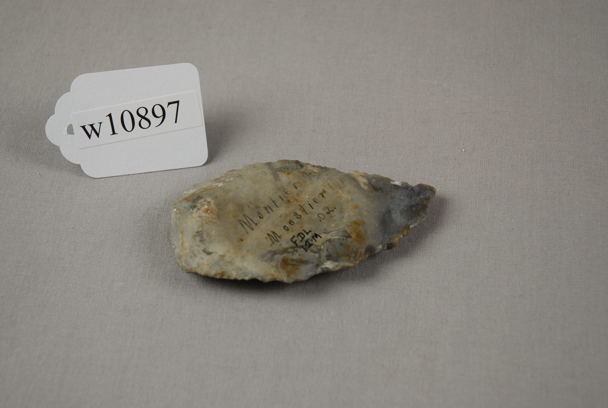 F DL / w10897 Knife Mousterian type Montiers, Near Amiens, France 12M L. Delambre, Purchased 1903 - '06 - J.H.W.