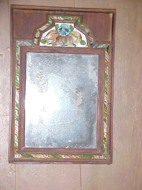 HFR / w04299 Mirror Courting Mirror - pansy at top. 17" x11 1/4" Gift of Roland Howard Antique courting mirror with floral decorated inset panels and original mirror glass. 18th c.