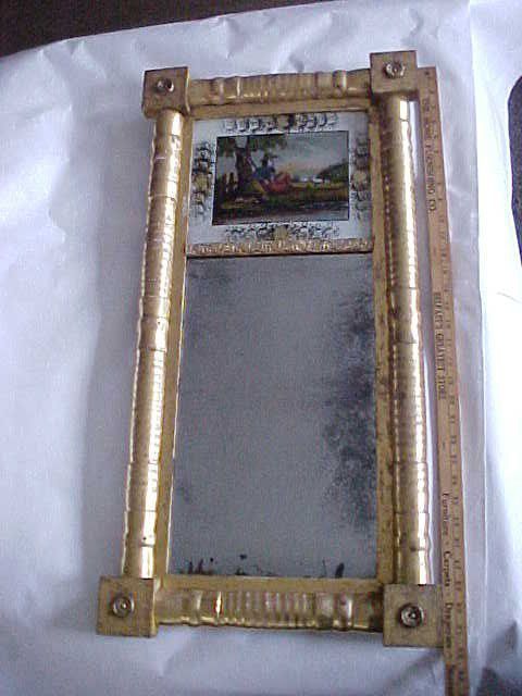 American Federal wall mirror with gilded half columns and corner blocks, eglomise upper glass of boy with fishing pole, c. 1810-20, 31 1/2" x 16", Original glass