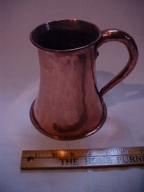 HUH / w04484 Copper Mug Bottom redone by donor's brother, Clarence. Gift of Roland Howard July 1981 Stands 6", top diam. 4" *crossfiled R.H. American copper mug with handle. 6"