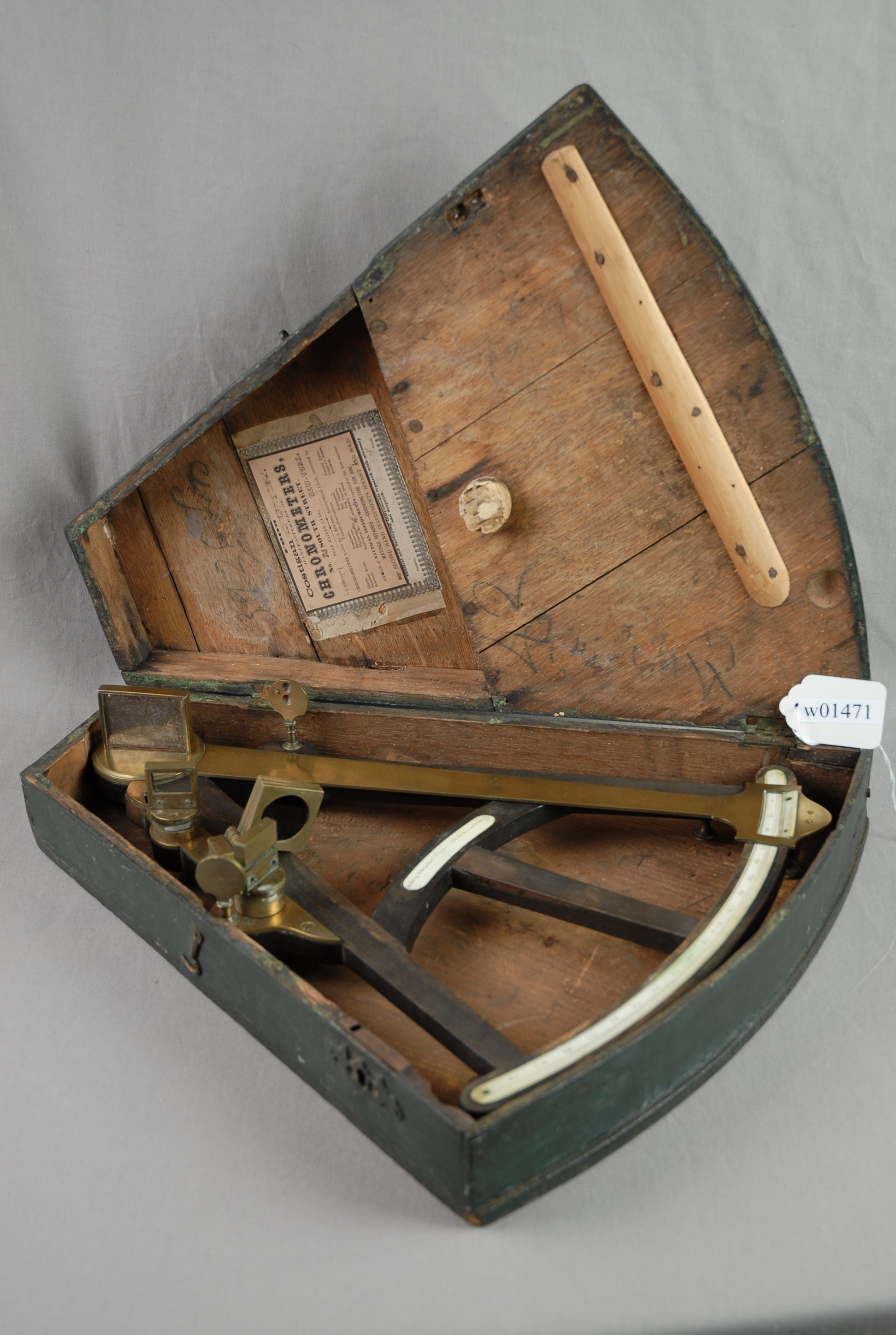 w01471 / S Octant and case. Used by Capt. Watson on the clipper ship "Baltic" "Made by I. Bradford Wapping Old Stairs London." 16" long; 14 3/4" wide at widest, 4" wide at narrowest.