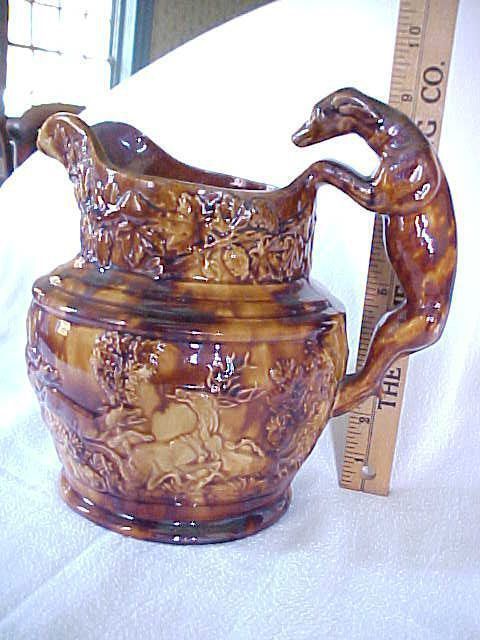 American Rockingham glaze hound handle pitcher with impressed mark "Taylor, Liverpool, Ohio" 9" h.