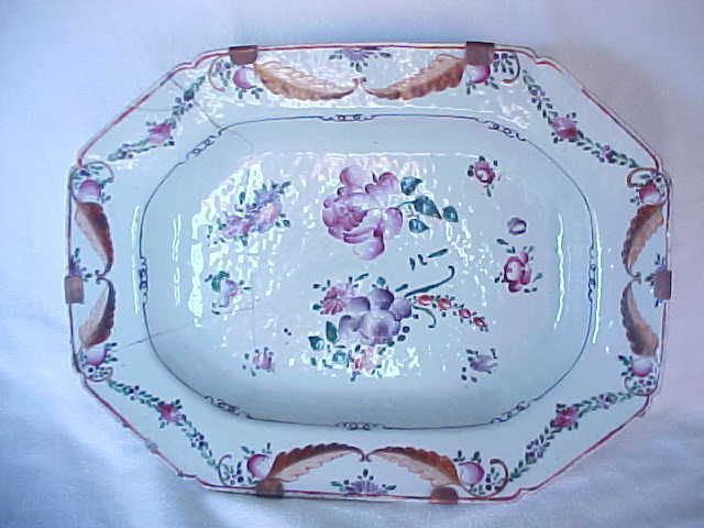 Chinese export porcelain deep dish platter decorated with overglaze painted flowers. 14 3/4" l. c. 1790. Repaired