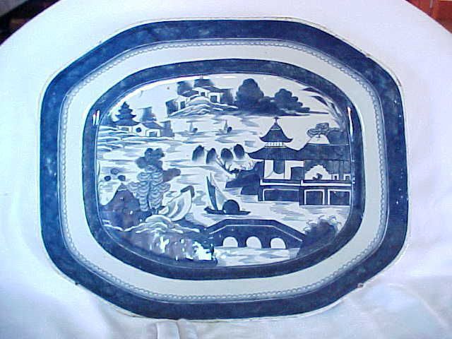 HUP / w04324 / PH Platter Canton ware 18" l., 15" w. White and dark blue. Mr. & Mrs. C. Russell Devereux 1969 Chinese Canton octagonal platter, c. 1800, 18 1/2" l.