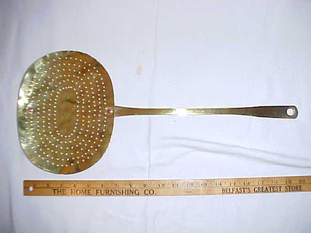 HUE / w04511 / P.H. K Skimmer Oval, all brass, flat with holes 9 1/2" Diameter. Gift of Dorothy Blake (1975) [sketch] American brass skimmer with handle. 20 1/2" long